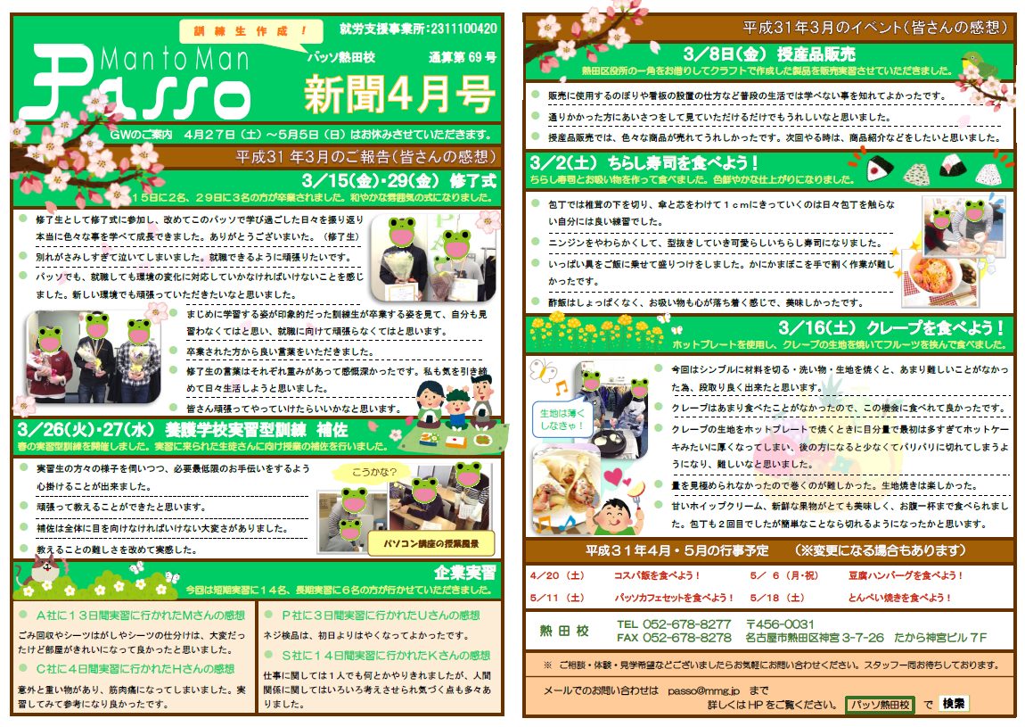 2019年4月17日 / 最終更新日時 : 2019年4月17日 wevadminn パッソ新聞 パッソ新聞2019年4月号を発行いたしました。 パッソ新聞2019年4月号を発行いたしました! バックナンバーは以下のページからダウンロードできます。 http://www.mmg-passo.com/newspaper/atsuta2019/ 是非ご覧ください。