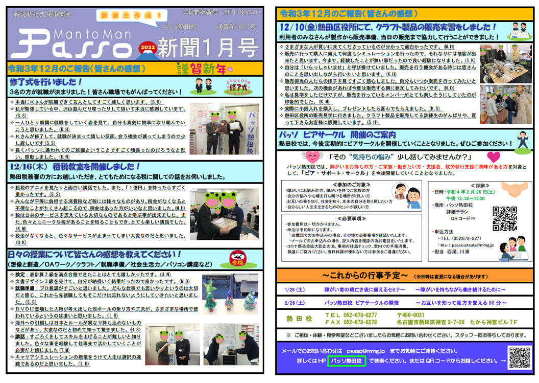 2022年1月10日 / 最終更新日時 : 2022年1月10日 wevadminn パッソ新聞 パッソ新聞2022年1月号を発行いたしました。 パッソ新聞2022年1月号を発行いたしました! バックナンバーは以下のページからダウンロードできます。 http://www.mmg-passo.com/newspaper/atsuta2021/