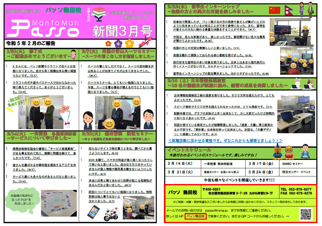 2023年3月10日 / 最終更新日時 : 2023年3月16日 wevadminn パッソ新聞 パッソ新聞2023年3月号を発行いたしました。 パッソ新聞2023年3月号を発行いたしました! バックナンバーは以下のページからダウンロードできます。 http://www.mmg-passo.com/newspaper/atsuta2023/