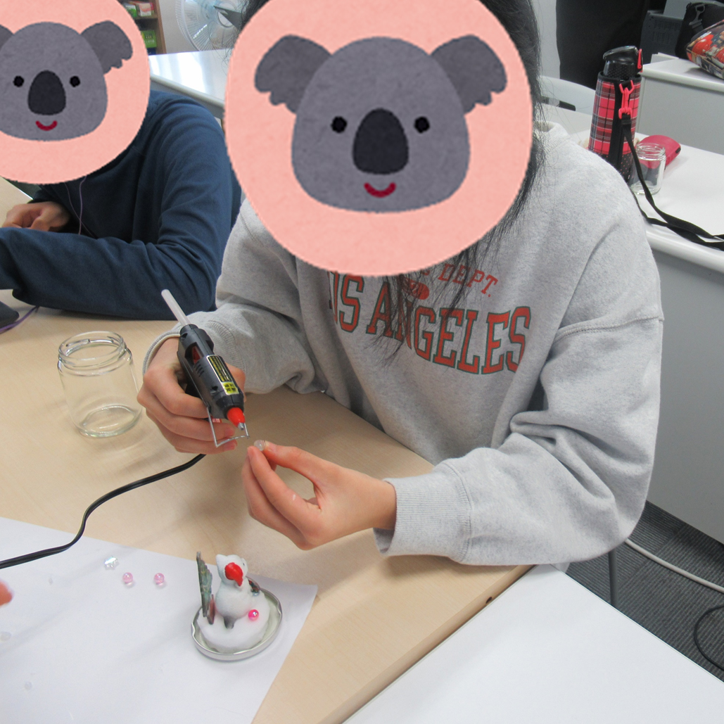 午後からは、スノードームを作りました。瓶の中に入れるフィギアを決め、どこに配置するか考えました。プラバンでツリーやトナカイを作り、土台のスポンジの上にグルーガンで貼り付けました。