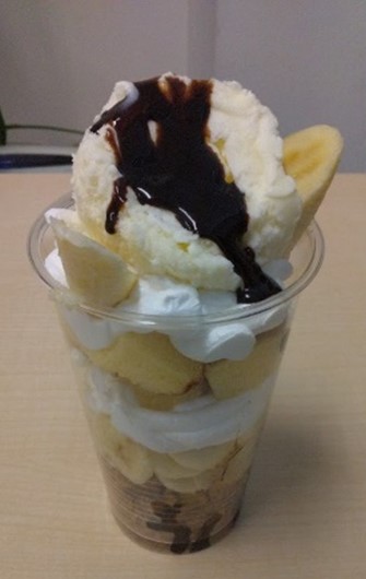 バナナは中に入れる用の輪切りと飾り用の斜め切りにして、カステラは6等分に切り、コーンフレーク、バニラアイス、生クリーム、チョコソースを入れて美味しそうなパフェが出来上がりました。