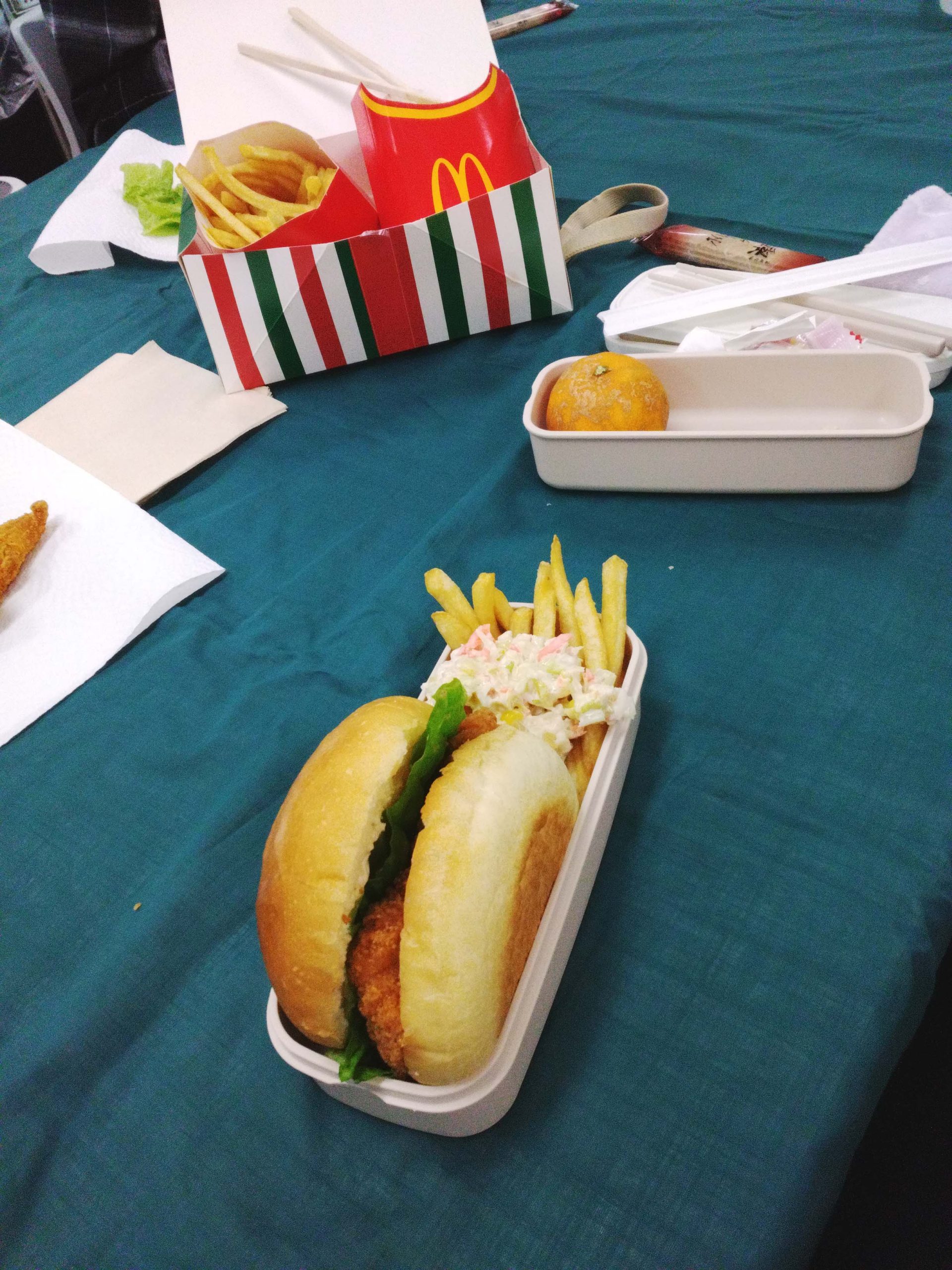 オニオンスープ、バンズにチキンやサラダを挟んだオリジナルハンバーガー、ポテト、スポンジ3種を細かくカットし、フルーツや生クリーム等トッピングしたカップケーキなど、自分たちで好みのものを作って食べました。
