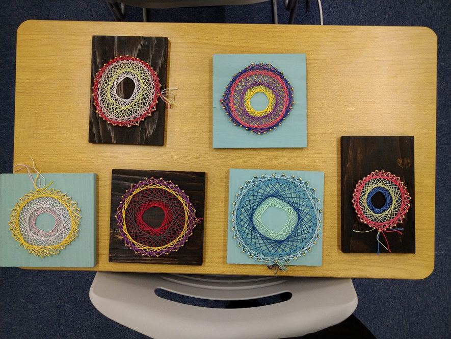 糸掛け曼荼羅では規則正しく糸を、釘に巻いていくと綺麗な丸の模様が出来ました。