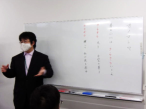 最後は「桜の花が ○○○○咲いた」「花びらが ○○○○散る」という文章にオノマトペを入れて、表現を豊かにしました。ちょっとしたことですが、表現のおもしろさや多様性にふれることのできた1時間でした。
