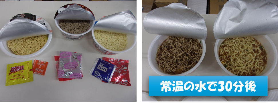 2.被災した時の為に、カップ麺(ラーメン・そば・焼きそば)を常温で作ろう!