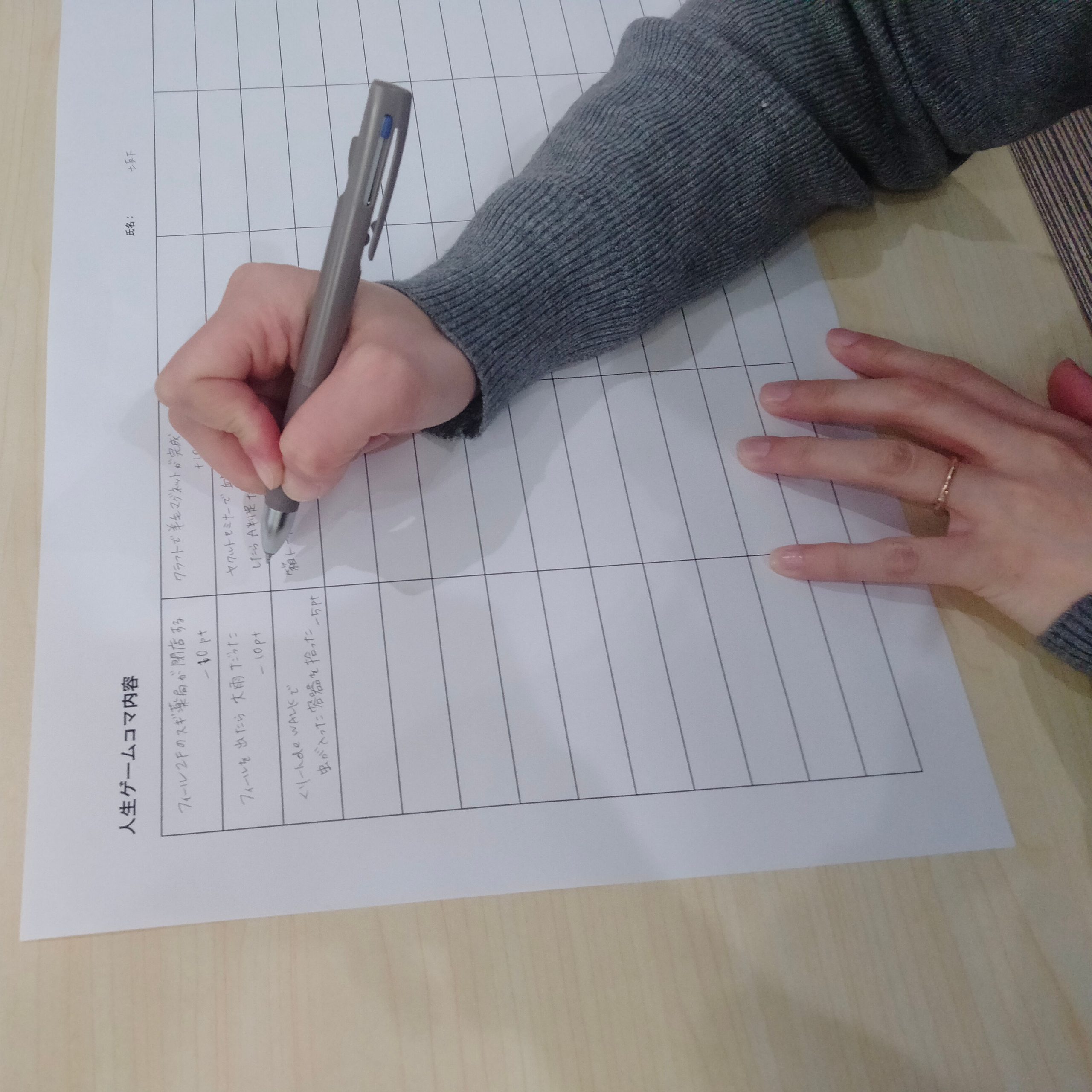 コマを進めてポイントを増やしていってゴールした時のポイントが多い人の勝利というルールに設定して、コマの内容とポイント数を各自でアイデアを考えて書き出してみました。パッソにちなんだことや日進でおなじみのこと、普段の生活で起こる嬉しいことや残念だったことなどを思い起こして、ポイントも事柄の大小で決めて書き出していきました。