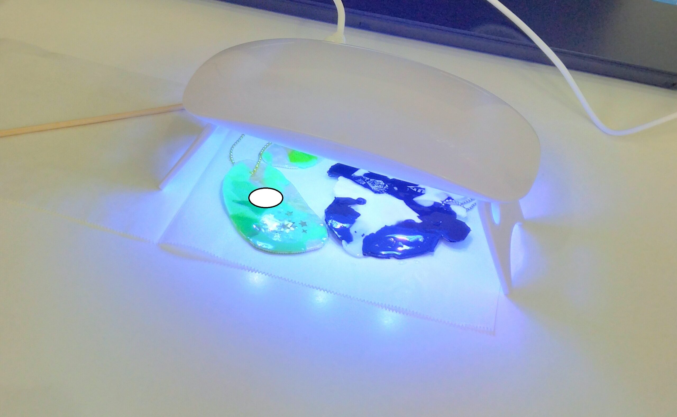 シールで名前や好きな模様を貼るなどデコレーションをしたのち、レジンを塗りツヤを出しました。ツヤが出るとますますマーブル模様が引き立ちます。