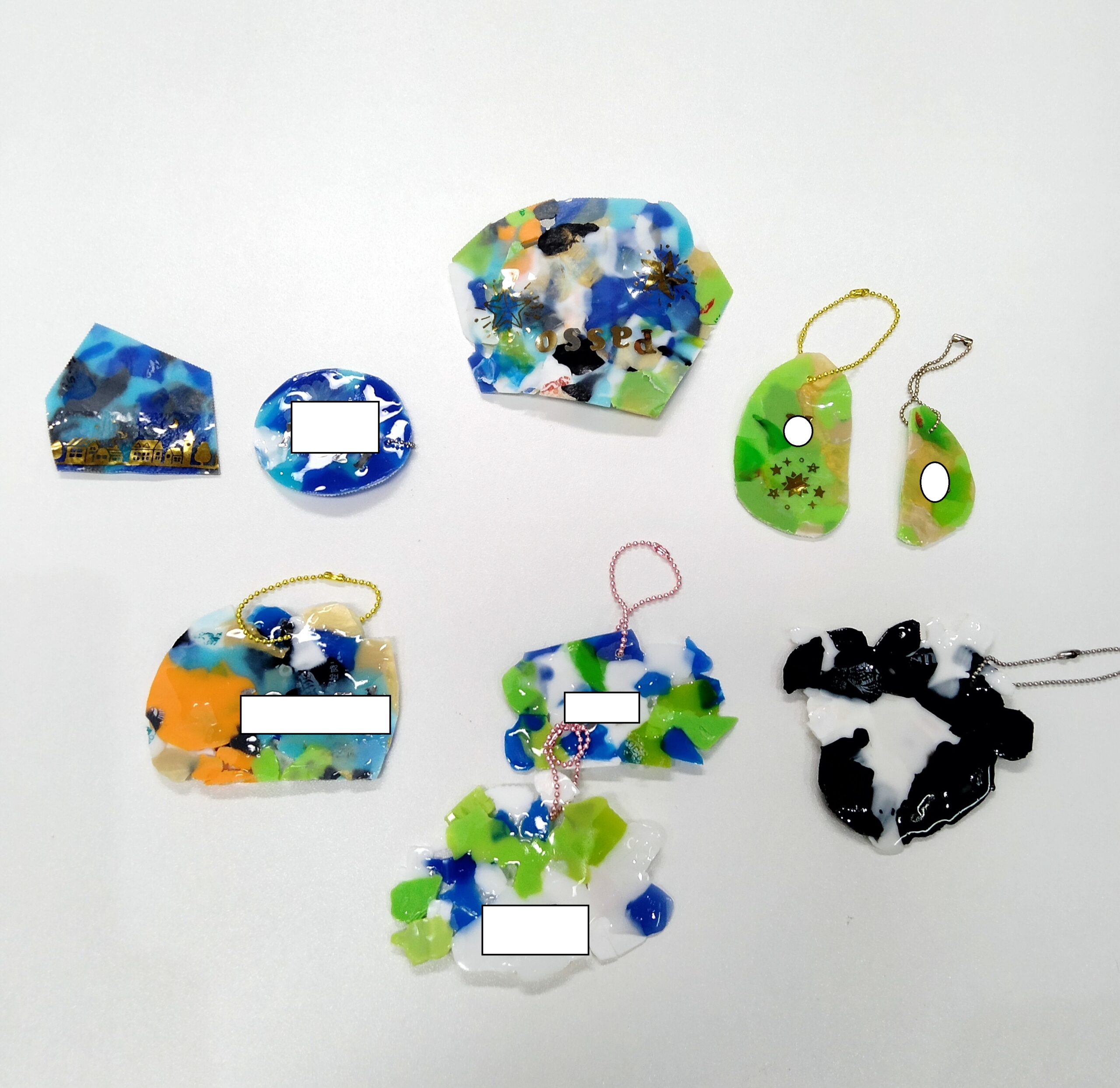 前もって訓練生の皆さんに協力いただき、ペットボトルキャップを細かくカットしました。好きな色合いで並べ、クッキングシートの上からアイロンで熱を加えると、キャップが溶けてきれいなマーブル模様のプレートが出来上がります。