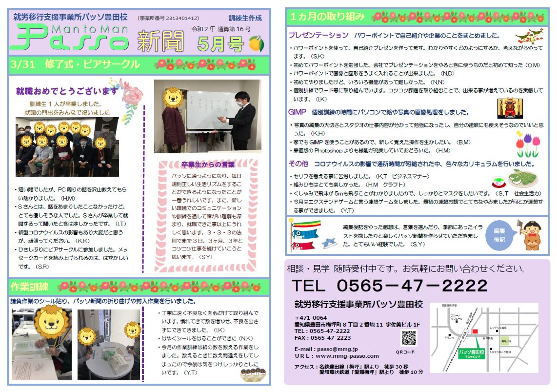 2020年5月11日 / 最終更新日時 : 2020年5月11日 wevadminn パッソ新聞 パッソ新聞2020年5月号を発行いたしました。 パッソ新聞2020年5月号を発行いたしました! バックナンバーは以下のページからダウンロードできます。 http://www.mmg-passo.com/newspaper/toyota2020/ 是非ご覧ください。