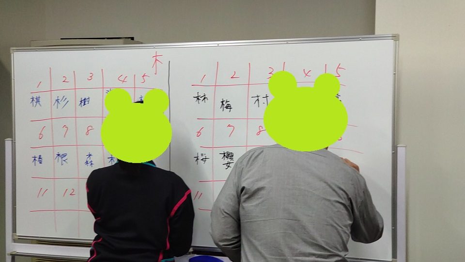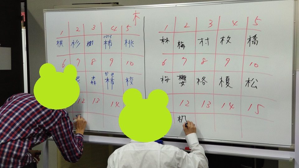 前半戦は部首を指定してどんだけ漢字が出るかを競い、後半戦は漢字を分解してものを提示して元の漢字が何だったのか当てることをしました。