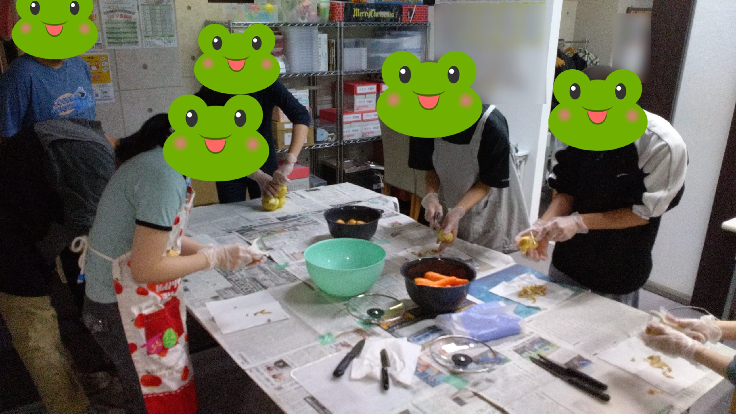 次は煮込み作業。柔らかくなるまでじっくり煮込みます。周りの手際もよく使わなくなった器具の洗浄。煮込んでいる間は訓練生全員で人生ゲームをやりました。夢中になりながらも交代でかき混ぜ、あく取り係。